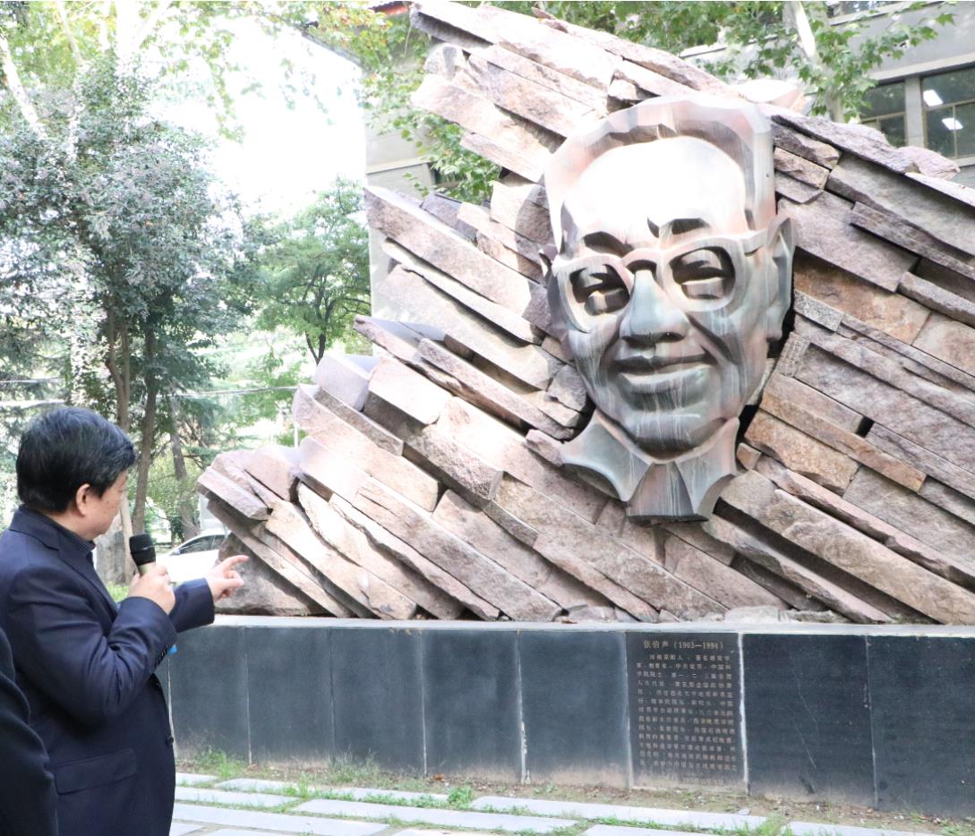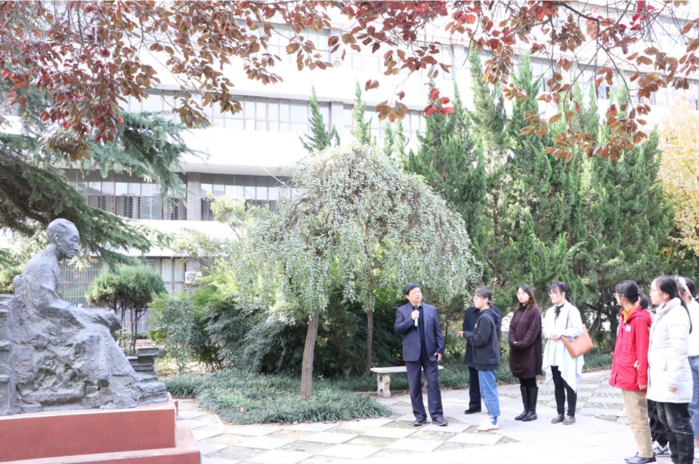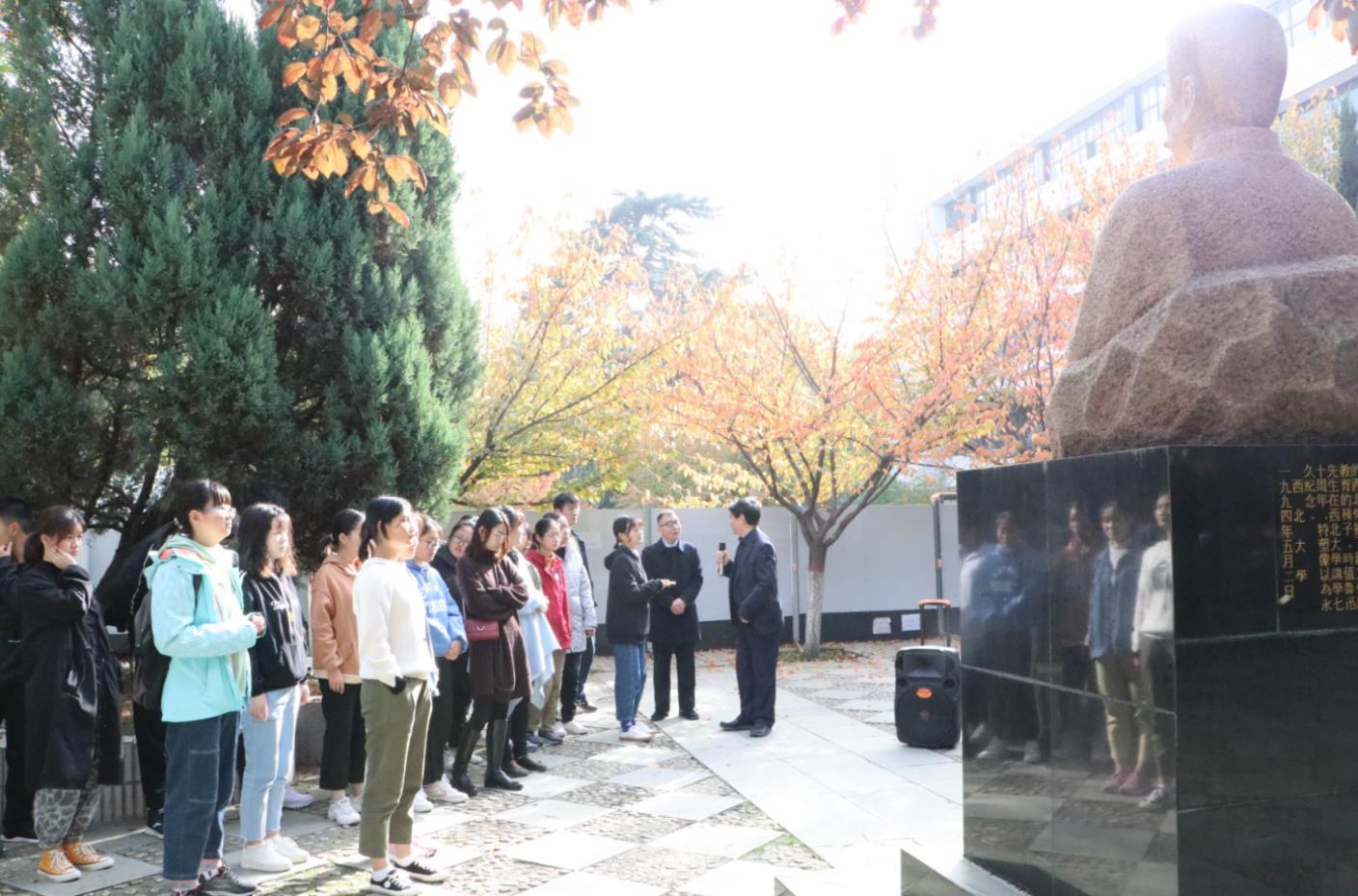 在侯外庐、张伯声、杨钟健、岳劼恒、鲁迅等名师人物雕塑前,姚远教授向同学们逐一讲述了他们和西大的渊源以及各自的学术成就。