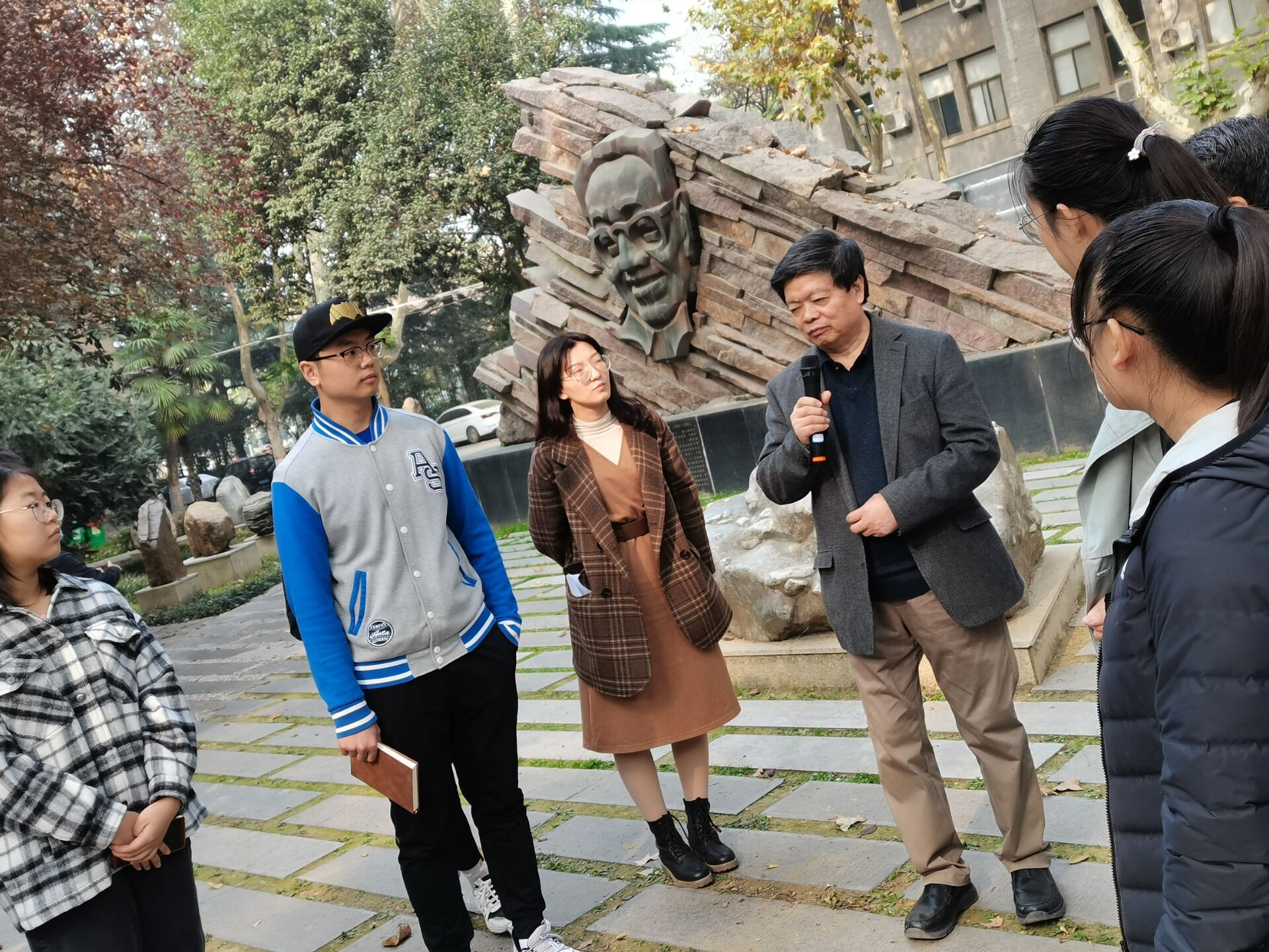 报告结束后,姚远教授带领同学们来到太白校区大礼堂西侧“东北大学校舍奠基纪念碑”及侯外庐、张伯声、杨钟健、鲁迅等名师人物雕塑前,历数在此发生的校史大事件。在原址回顾那段历史,同学们对一代代西大人默默耕耘、艰苦办学、建设西北的光荣历史有了更深刻更真切的体会。