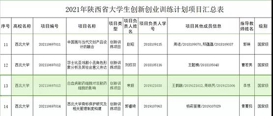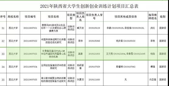 根据陕西省教育厅《关于公布2021年大学生创新创业训练计划项目名单的通知》(陕教高办﹝2021﹞21号),澳门正规共4个项目获批立项。其中,国家级项目2项,省级项目2项。