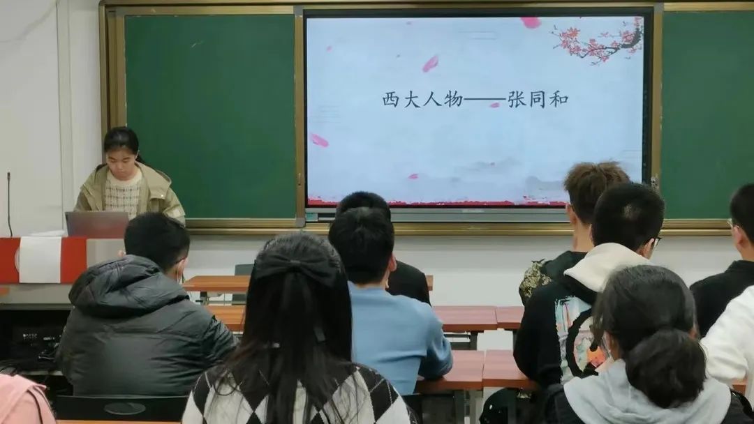 朱奕萱向青年团员介绍了西大人物——我国外科学事业的重要开拓者张同和,带领青年了解张先生的革命贡献、临床贡献和坚持著书立说的榜样事迹。