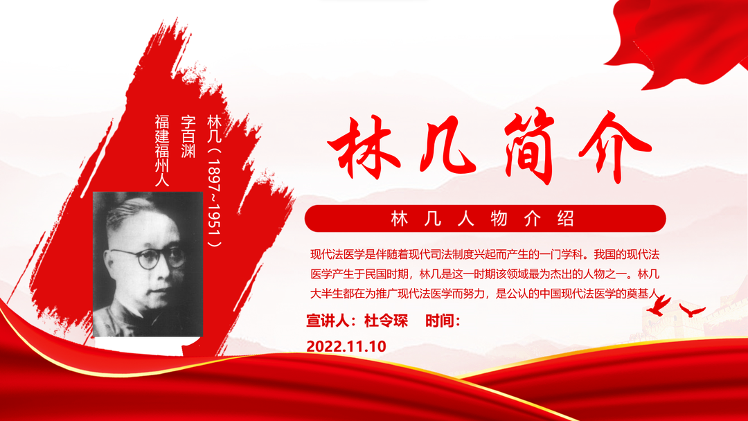 杜令琛讲述了我国现代法医学奠基人--林几先生的一生,回顾了我国法医学的发展,从人物生平、主要事迹、成就贡献三方面带领团员们学习了林几先生的先进事迹。