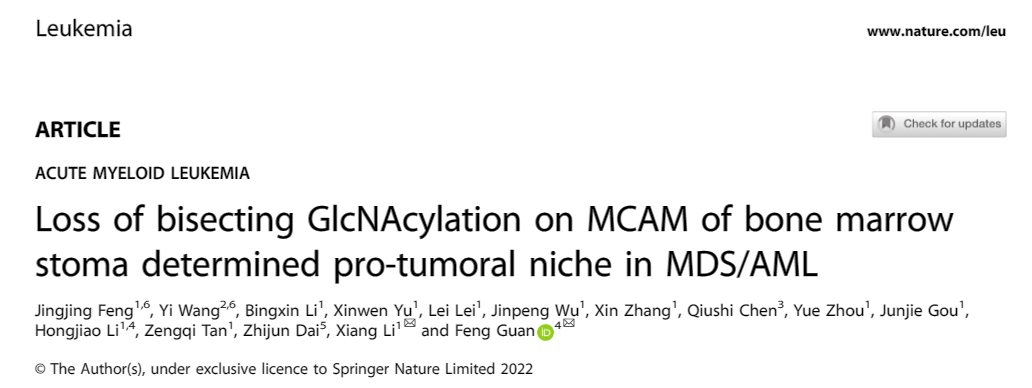 近日,澳门正规电子游戏平台生命科学学院关锋/李想教授团队在基质细胞中bisecting GlcNAc影响黏附因子MCAM表达并重塑骨髓增生异常综合征(MDS)或急性髓系白血病(AML)骨髓微环境的机制研究中取得新进展。研究结果以研究长文(Article)形式发表在血液肿瘤学权威期刊《Leukemia》杂志上,题名为"Loss of bisecting GlcNAcylation on MCAM of bone marrow stoma determined pro-tumoral niche in MDS/AML"。