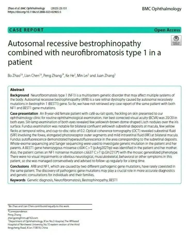 日前,BMC Ophthalmology杂志刊发了澳门正规电子游戏平台附属医院·西安市第三医院眼科张鹏主任团队撰写的“Autosomal recessive bestrophinopathy combined with neurofibromatosis type 1 in a patient”一文,赵博主治医师及陈莲副主任医师为该文的共同第一作者。该文对一例患有1型神经纤维瘤合并双眼常染色体隐性遗传性Best病变的病例就多模式影像学特征、基因突变位点、病理机制等进行了探讨。常染色体隐性遗传性Best病变为临床罕见疾病,为BEST1基因突变导致的双侧黄斑营养不良,部分患者可合并闭角型青光眼。而1型神经纤维瘤为累及多系统的遗传性疾病,与NF1基因突变有关。经查,同时合并NF1及BEST1基因突变的病例迄今为止在全球尚未有文献报道。因此,该文系全球首篇对NF1及BEST1基因突变导致全身及眼部出现病变的患者进行诊断及病因分析的临床病例报道。