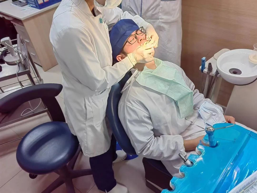 口腔医学班观摩了患者拔牙过程,了解了口腔CT使用方法,并使用莱卡显微镜相互做了口腔检查,最后观摩了口腔修复相关准备工作,体验了牙模制作。