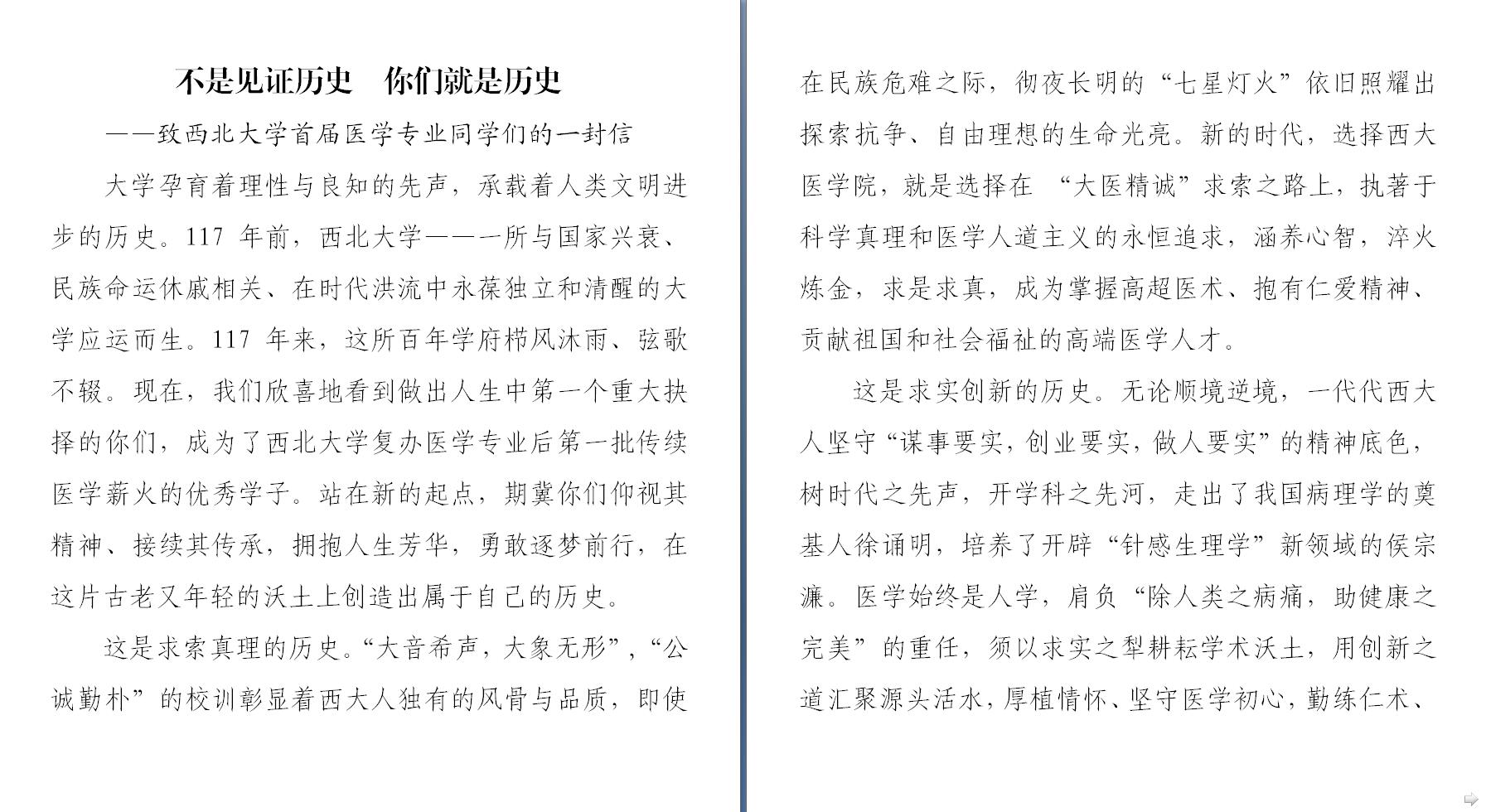 这是求实创新的历史。无论顺境逆境,一代代西大人坚守“谋事要实,创业要实,做人要实”的精神底色,树时代之先声,开学科之先河,走出了我国病理学的奠基人徐诵明,培养了开辟“针感生理学”新领域的侯宗濂。医学始终是人学,肩负“除人类之病痛,助健康之完美”的重任,须以求实之犁耕耘学术沃土,用创新之道汇聚源头活水,厚植情怀、坚守医学初心,勤练仁术、传承医学精诚。