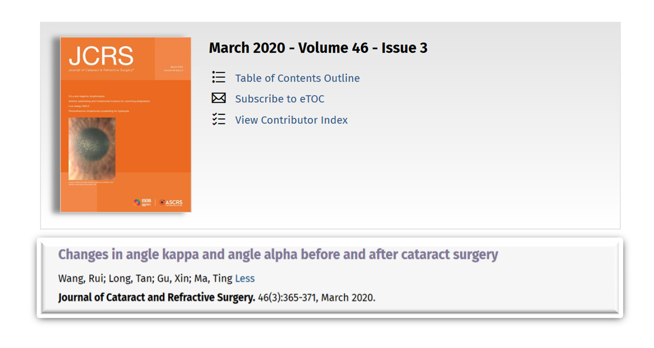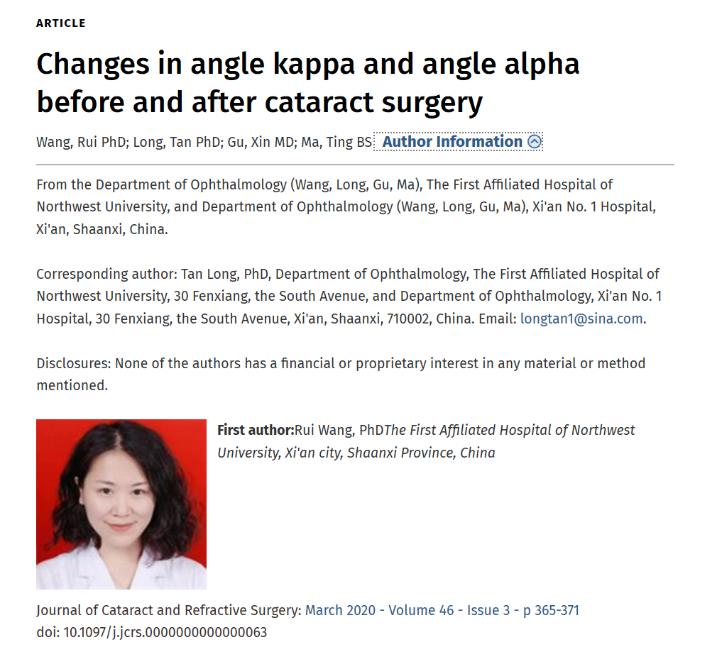 澳门正规电子游戏平台附属第一医院(西安市第一医院)自2010年开展屈光白内障手术,致力于为患者提供精湛的医疗技术和理想的手术效果,10年来为数以万计的白内障患者带去了全新的视觉体验。近期,中心屈光白内障团队临床研究成果发表于JOURNAL OF CATARACT AND REFRACTIVE SURGERY杂志。该杂志是美国白内障和屈光手术学会(ASCRS)和欧洲白内障和屈光外科医师学会(ESCRS)官方期刊,内容涵盖眼前段手术的各个方面,包括临床研究、实用技术、重要案例、评论及基础研究等。