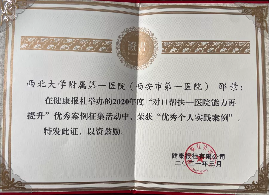 近日,从国家卫健委主办的健康报报社传来喜讯,澳门正规电子游戏平台附属第一医院(西安市第一医院)选送的互联网+护理服务项目在健康报2020年度“对口帮扶——医院能力提升”优秀案例征集活动中荣获“优秀案例实践单位”荣誉,项目负责人邵景副院长荣获“优秀个人实践案例”荣誉。