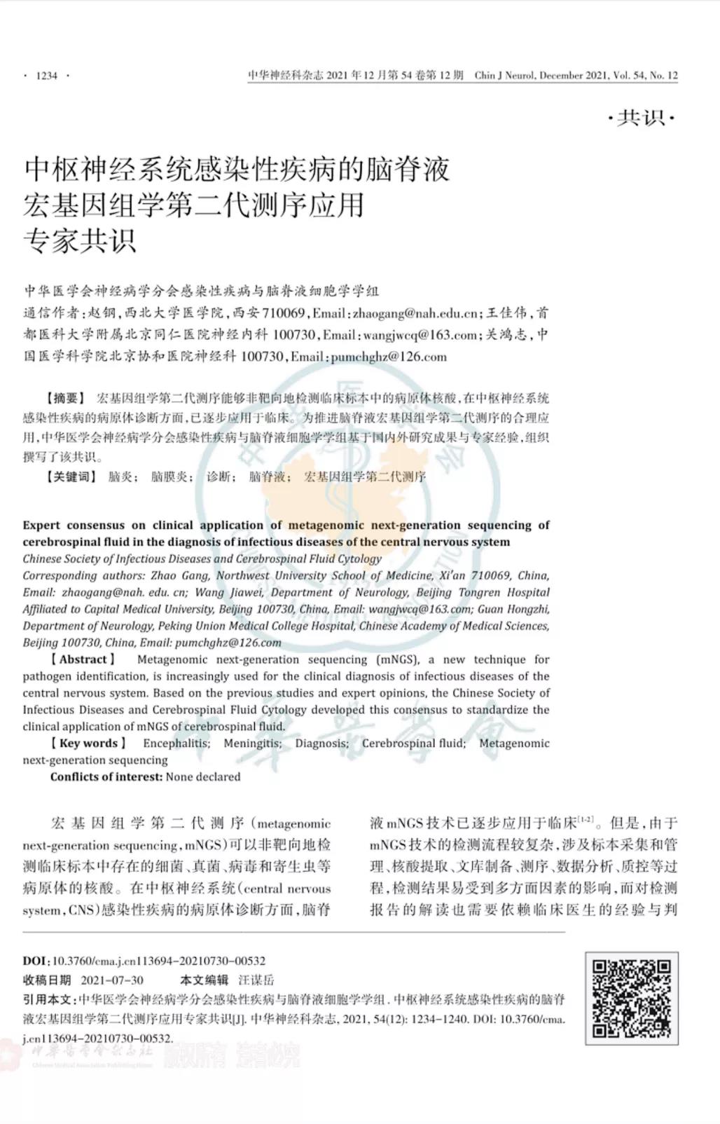 2021年12月15日,由澳门正规院长赵钢教授牵头,联合中国医学科学院北京协和医院、首都医科大学附属同仁医院及上海复旦大学附属中山医院等共44家单位53位相关领域的顶级专家,共同起草撰写的“中枢神经系统感染性疾病的脑脊液宏基因组学第二代测序应用专家共识”,在《中华神经科杂志》上正式发表。该专家共识是在赵钢教授团队牵头的2016年科技部重大精准医学项目——基于组学特征谱的脑(膜)炎病因分型诊断研究——历时五年不断研究探索的基础上总结凝练而成,是临床标志性、纲领性的重要指导规范。