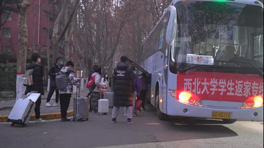 校党委书记王亚杰、副校长常江登上送站大巴,和返家学生一起前往西安北站。校党委副书记张清继续带领全体工作人员统计数据核查人数,有序组织学生排队上车,点对点运送学生直达两站一场。