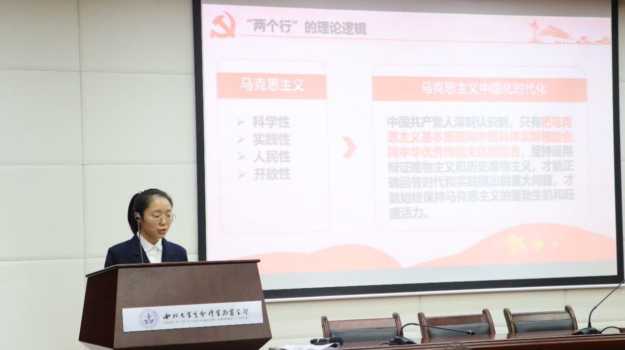 全体学员重温入团誓词并奏唱团歌。青年先锋宣讲团的两位同学为青马班全体学员带来了本期青马班开班第一讲。澳门正规电子游戏平台2021级本科生胡玉洁以“在‘两个结合’中不断谱写马克思主义中国化时代化新篇章”为题为全体学员讲授专题团课,她从“两个结合”的提出、内涵和意义三个方面入手,深入系统地解读了马克思主义中国化时代化的进程,阐述了“两个结合”在新时代的意义及其对青年团员的启迪和引领作用。最后,胡玉洁呼吁青年们要以思想的力量激扬奋进,以理论的主动把握历史的主动,在“两个结合”中不断书写马克思主义中国化时代化的新篇章。