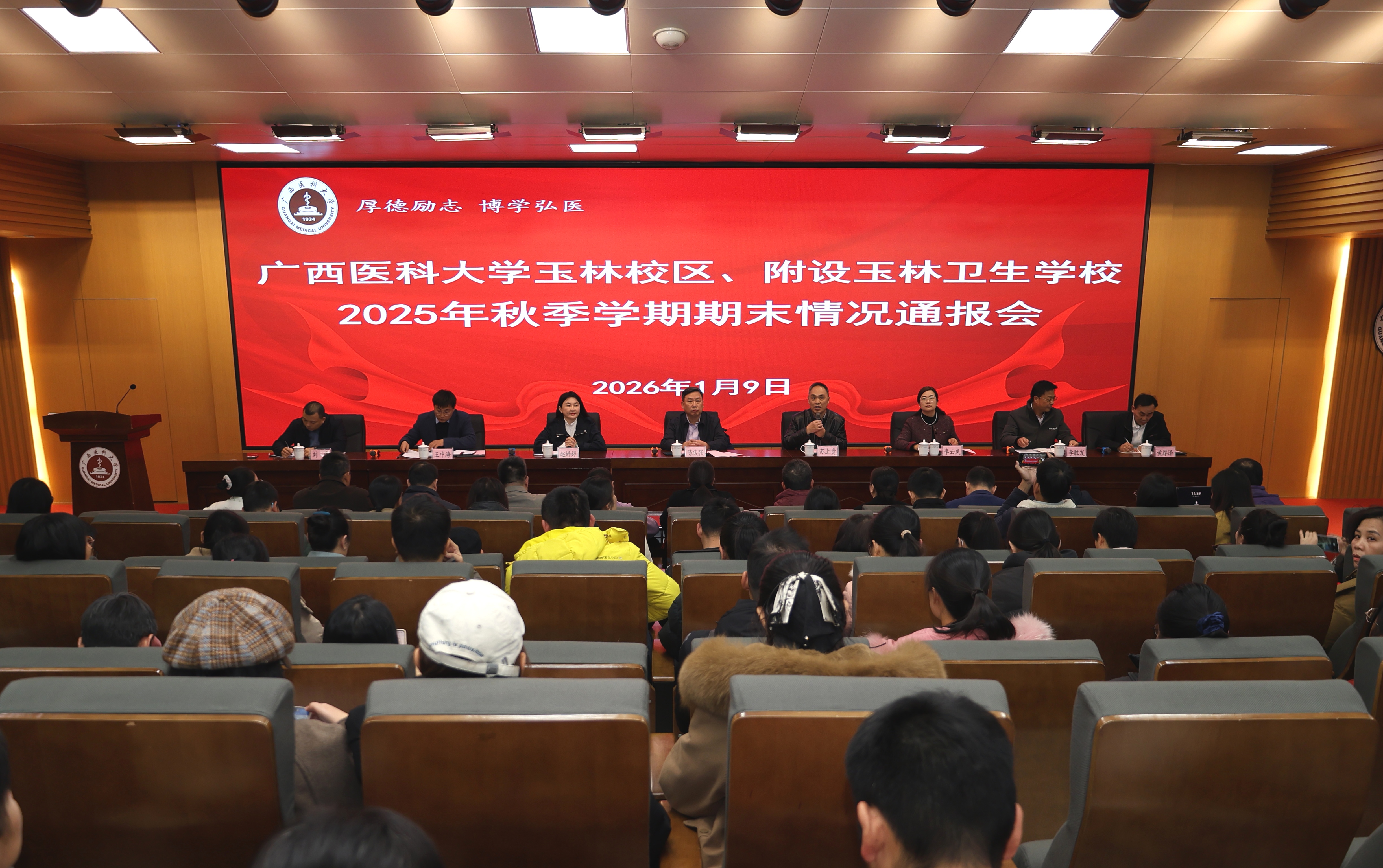 1月9日,学校党委常委、副校长陈俊强出席玉林校区、附设玉林卫生学校2025-2026学年秋季期期末通报会,并就期末各项工作作出指导。通报会由玉林校区、附设玉林卫生学校党委书记苏上贵主持,玉林校区、附设玉林卫生学校班子领导及全体教职工参加会议。