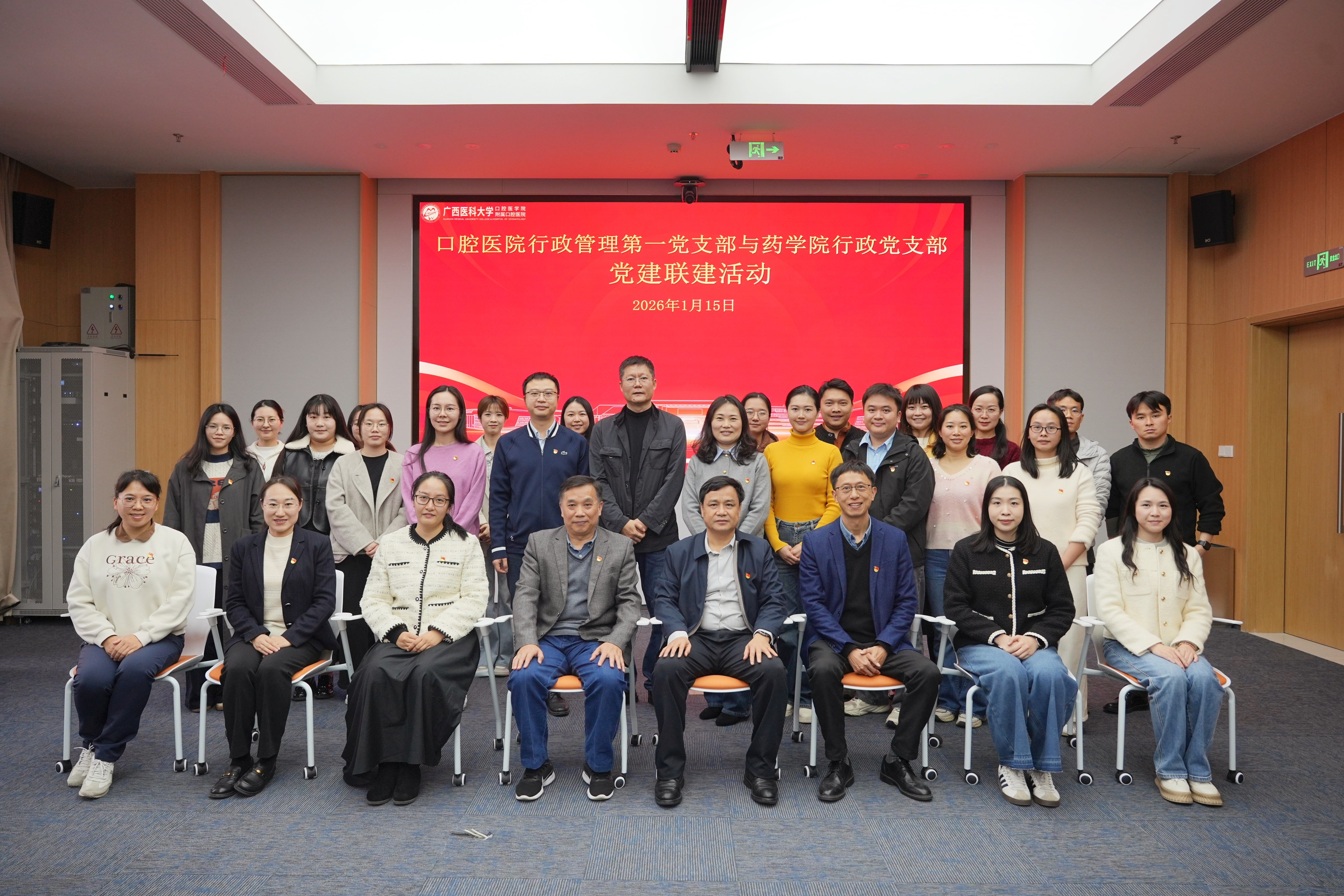 为进一步拓展党建+业务融合发展新路径,拓宽毕业生就业渠道,深化与附属医院的协同合作,1月15日,药学院行政党支部赴附属口腔医院五象院区,与医院行政管理第一党支部开展联建活动。附属口腔医院党委书记韦锦斌、药学院党委书记文秋林及相关支部党员、科室代表共同参与。