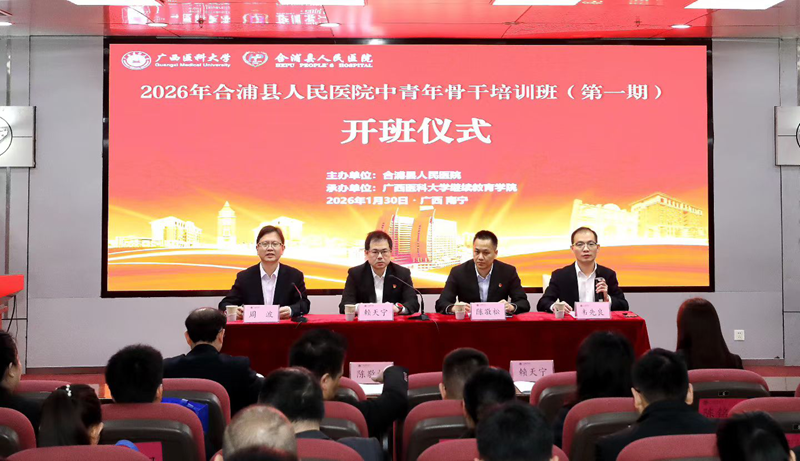 1月30日至2月1日,beat365官方网站继续教育学院在校本部举办2026年合浦县人民医院中青年骨干培训班(第一期)。合浦县人民医院党委书记赖天宁、院长陈敬松,继续教育学院院长周波等出席开班仪式,副院长韦先良主持开班仪式。合浦县人民医院及医共体单位57名中青年骨干参加培训。