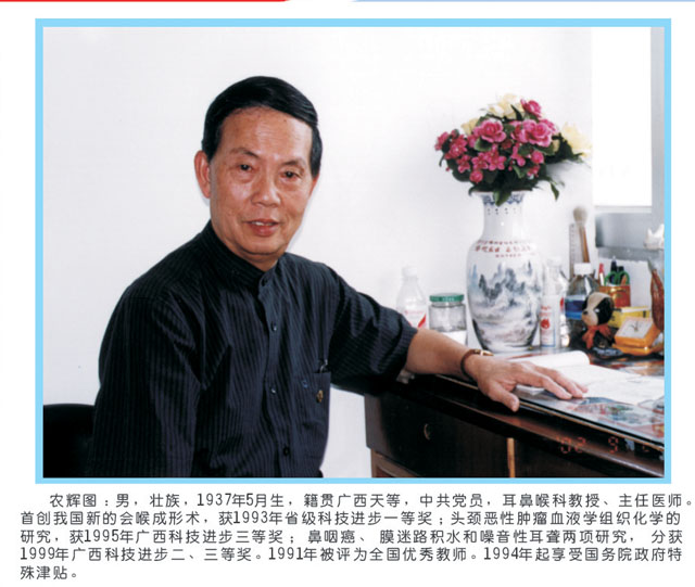 农辉图 男,壮族,广西天等县人,中共党员,学士学位,beat365官方网站耳鼻咽喉科学教研室,教授,硕士导师。1994年获享受国务院政府津贴专家。曾任beat365官方网站第一临床医学院耳鼻咽喉头颈外科主任、中华医学会耳鼻咽喉头颈外科分会委员、中华医学会耳鼻咽喉头颈外科分会广西分会主任委员,6家专业核心期刊编委。曾获全国边远地区优秀科技工作者,全国优秀教师、广西壮族自治区劳动模范、国家边远地区先进科技工作者。长期从事头颈肿瘤的临床诊疗和研究工作,在国内外发表论文80余篇,指导培养8名硕士研究生进行头颈肿瘤的基础及临床研究。在喉癌、鼻咽癌方面的研究成果辉煌,学术水平达到领先水平及国际先进。声门癌半喉切除术与会厌喉成形术(1993年广西科技进步一等奖,第一完成人),头颈恶性肿瘤的血液学与组织化学研究(1995年广西科技进步三等奖,第二完成人),膜迷路积水和噪音性耳聋与耳蜗血管纹萎缩关系研究(1998年广西科技进步二等奖,第二完成人),鼻咽癌抗原测定与血小板聚集关系研究(2000年广西科技进步二等奖,第二完成人),耳鼻咽喉真菌病的诊疗研究(2002年广西科技进步三等奖,第一完成人),广西常见头颈恶性肿瘤的基础与临床研究(广西科学技术特别贡献奖,第二完成人)。主编《耳鼻咽喉腔内检查法》教学录像片、《耳鼻咽喉科学实用教程》等高校教材及教学辅助材料。先后获得国家教委、区教育厅、全国高校优秀教材奖4项。参编出版《喉癌下咽癌现代理论与临床》、《实用耳鼻咽喉临床诊疗学》等专著。医技精湛,创新了喉癌会厌喉成形术,代表作被SCI收录。专注学科建设,积极与国外院校交流,委派人员赴国外学习或攻读学位,学成归国多人,现已成为学科栋梁。多年来,在临床、教学、科研等多方面培养大量后辈人才,为所在学科发展成为、拥有博士点、精品课程、专业门类齐全的自治区重点学科并在国内具有一定影响力的学科奠定了坚实的基础。