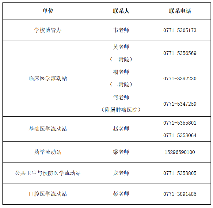 (四)未尽事宜,请联系所在流动站或学校博士后工作管理办公室,联系人及联系方式如下: