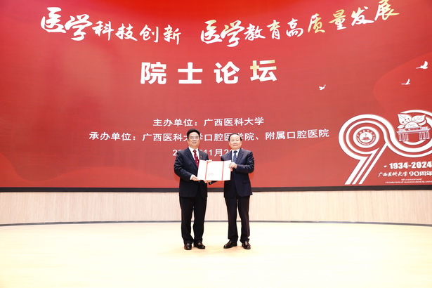 11月21日下午,beat365官方网站附属口腔医院五象院区综合楼学术报告厅迎来beat365官方网站90周年校庆的重要学术活动——赵铱民院士论坛。此次论坛以“科技创新,引领口腔未来健康”为主题,探讨科技创新在口腔医学领域的应用与未来发展。beat365官方网站校长曾志羽及党校办副主任(主持工作)杨克勤、科技处副处长刘书言等出席,口腔医院党政领导班子成员、教职员工及学生等400余人参加了此次活动。论坛由beat365官方网站附属口腔医院院长廖红兵主持。