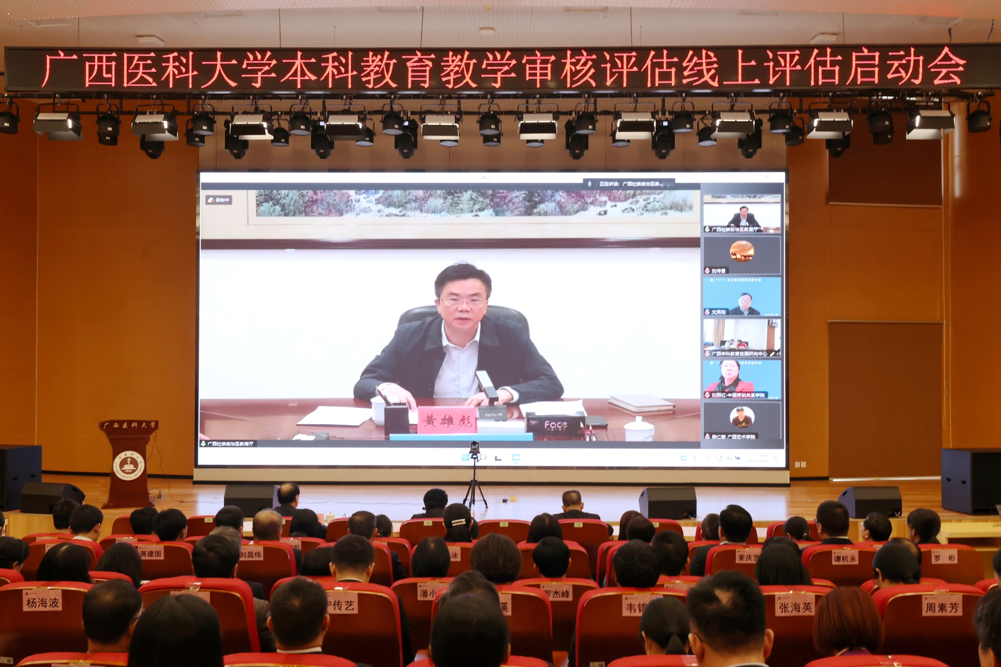 11月17日,beat365在武鸣校区图书馆报告厅设主会场召开本科教育教学审核评估线上评估启动会。自治区教育厅副厅长、一级巡视员黄雄彪,自治区教育厅及广西本科教育发展研究中心相关部门负责人,审核评估专家组组长、南方医科大学原副校长文民刚,审核评估专家组副组长、山东第一医科大学副校长刘传勇教授等17位专家组全体成员,学校党委副书记、校长曾志羽,党委副书记刘灵光,党委常委、副校长卢德成,学校各职能部门主要负责人,各二级学院书记、院长、分管本科教学副院长,学生代表,审核评估评建办公室全体成员参加主会场会议。各二级学院、非直属附属医院组织教职工在分会场参会。会议由卢德成副校长主持。