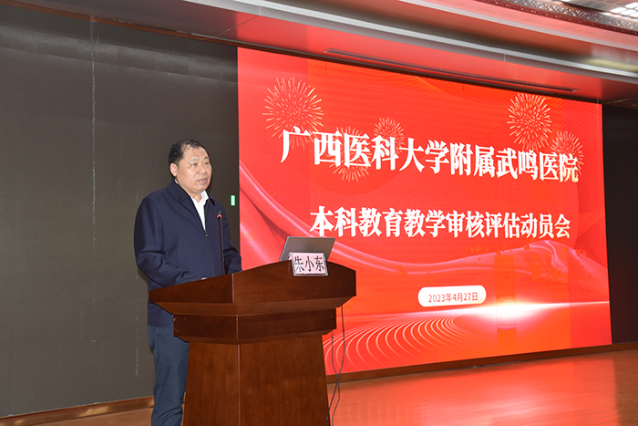 为做好新一轮本科教育教学审核评估工作,4月27日下午,附属武鸣医院在1号楼21楼学术厅召开本科教育教学审核评估动员会。全体院领导、中层干部、第二届教学督导组专家、全体教研室、科室主任及副主任、教学秘书、教师代表及学生代表参加了会议。会议由陈茂伟副院长主持。