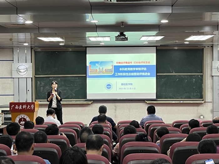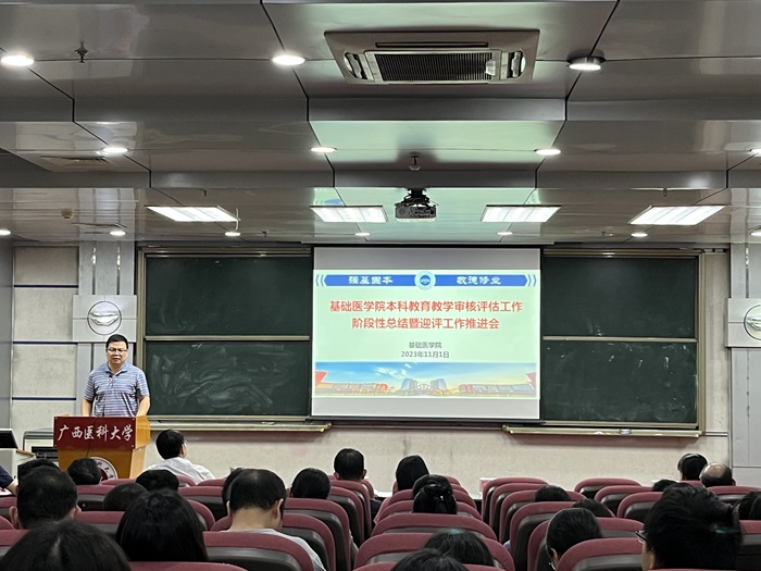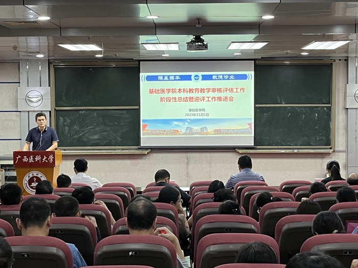 为全面迎接新一轮本科教育教学审核评估工作, 11月1日下午,基础医学院召开本科教育教学审核预评估总结暨迎评推进会,学院党委书记谭机永,副书记李文奇,副院长罗彬、蓝秀万以及学院全体教职工参加会议,会议由党委副书记李文奇主持。