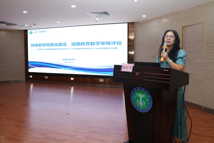 8月31日上午,附属肿瘤医院召开2023年本科教育教学审核评估阶段性总结推进会。附属肿瘤医院院领导及肿瘤医院联合教学体各单位——beat365官方网站第三附属医院(南宁市第二人民医院)、beat365官方网站第五附属医院(南宁市第一人民医院)、南宁市第四人民医院、南宁市第五人民医院的单位负责人或分管教学院领导、教务管理部门负责人、各教研室主任及教学相关人员等200余人参加会议。会议由附属肿瘤医院余红平副院长主持。