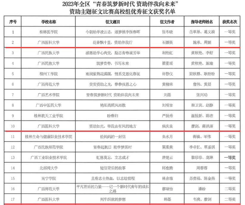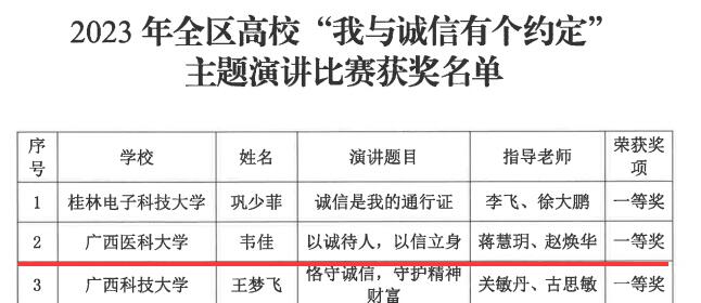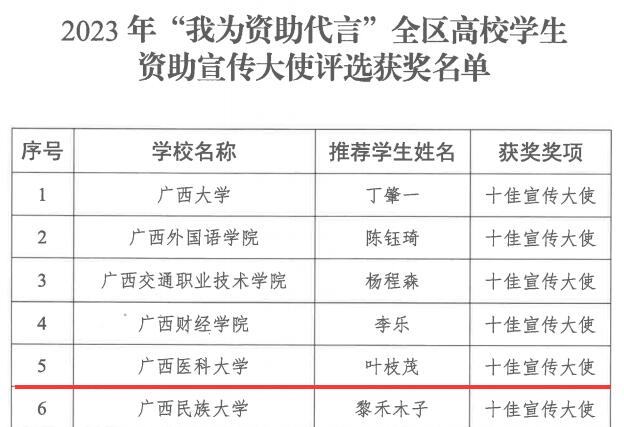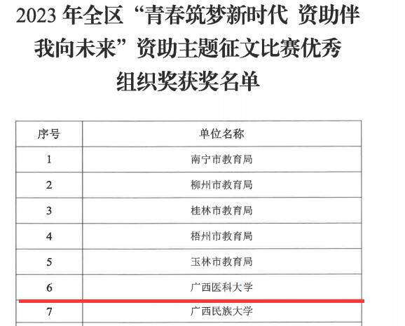 近日,自治区教育厅公布了2023年全区高校“青春筑梦新时代 资助伴我向未来”资助主题征文比赛、“我与诚信有个约定”主题演讲比赛、“我为资助代言”学生资助宣传大使评选等系列主题比赛的评选结果,beat365获得数项集体及个人荣誉。其中,beat365获得全区“青春筑梦新时代 资助伴我向未来”资助主题征文比赛优秀组织奖,药学院学生石娜英、第一临床医学院学生庾庆良均获得征文比赛一等奖,口腔医学院学生韩磊获得征文比赛二等奖。在演讲比赛中,beat365护理学院学生韦佳从初赛、半决赛一路晋级,最终在决赛获得一等奖的好成绩。在学生资助大使评选活动中,口腔医学院的叶枝茂同学荣获“十佳宣传大使”称号。在以上活动中,施承、周媚、廖剑、蒋洪涛、蒋慧月、赵焕华、韦爽等七位老师获评优秀指导教师。
