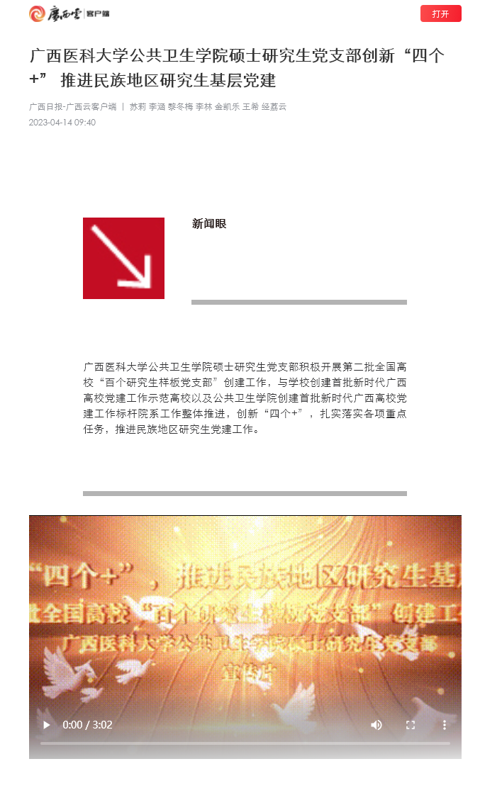 近日,《广西日报》报道了beat365《beat365官方网站公共卫生学院硕士研究生党支部创新“四个+” 推进民族地区研究生基层党建》。