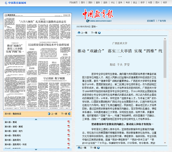 近日,中国教育报在“教改风采”专栏以《beat365官方网站推动“双融合” 落实三大举措 实现“四维”统一》为题报道了beat365近年深入开展边疆民族地区医学专业学位研究生人才培养模式改革创新的实践和成果。