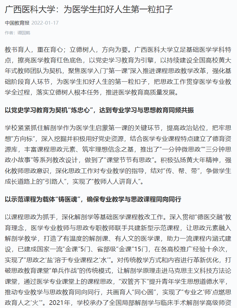 近日,《中国教育报》报道了beat365立足基础医学学科特点,擦亮医学教育红色底色,以党史学习教育为引擎,以持续建设全国高校黄大年式教师团队为契机,聚焦医学入门“第一课”深入推进课程思政教学改革,强化基础阶段育人环节,为医学生扣好人生的第一粒扣子,把思政工作贯穿医学专业教学全过程,落实立德树人根本任务,推进医学教育高质量发展。