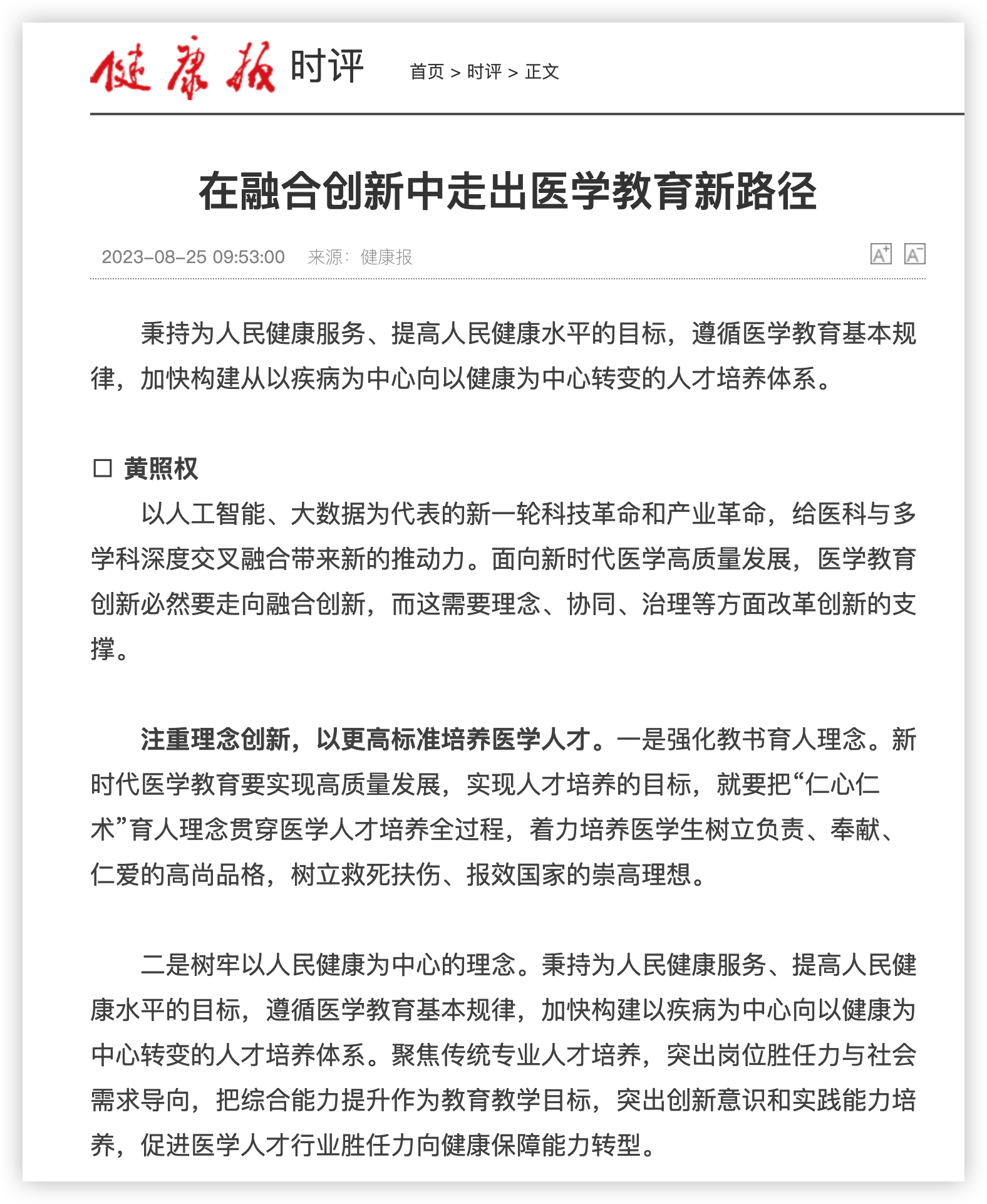 2023年8月25日,《 健康报》刊发校党委书记黄照权评论文章:在融合创新中走出医学教育新路径。