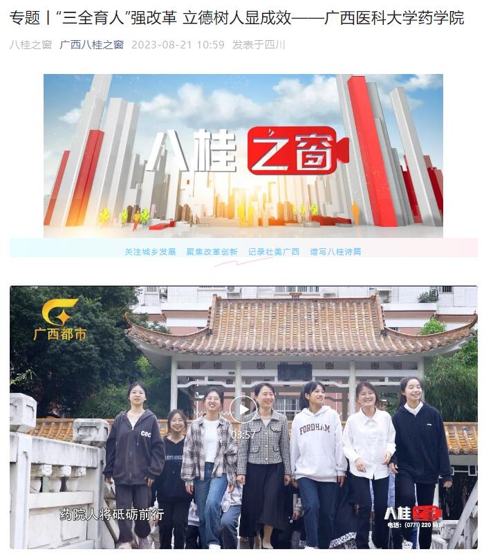 近日,广西广播电视台都市频道报道了beat365官方网站药学院党建工作成效:“三全育人”强改革 立德树人显成效——beat365官方网站药学院。